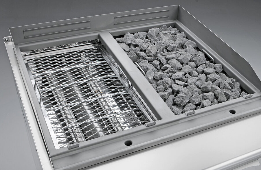 - Rejillas de varilla AISI 304 regulable con asas atérmicas, antisalpicaduras extraíble con canal de recogida de líquidos con drenaje en cajón extraíble, cámara de cocción de acero, rejilla de soporte de piedra lávica AISI 316.